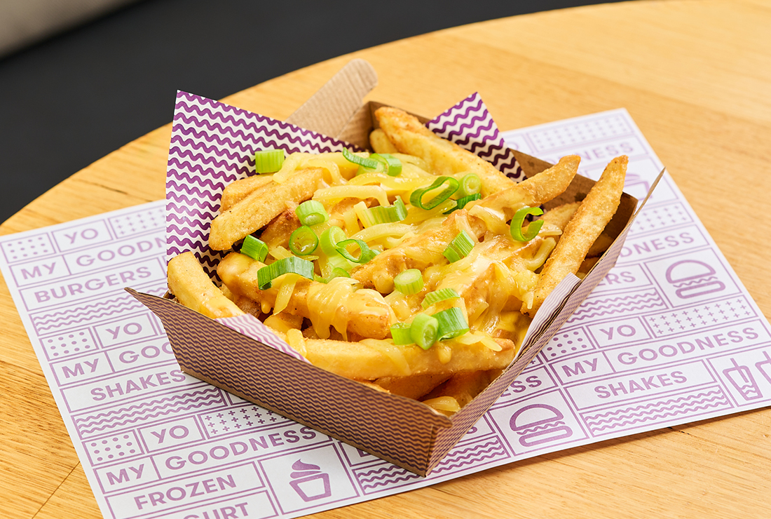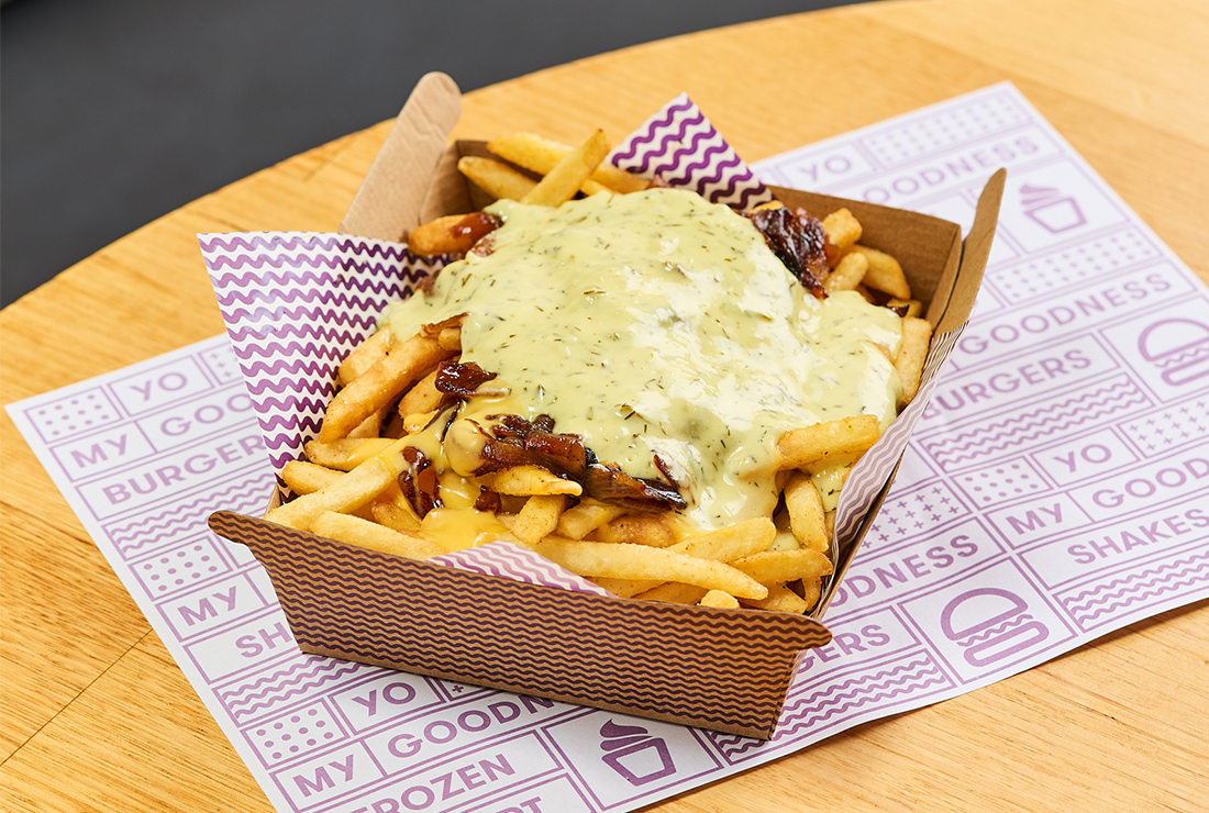 cheese sauce, caramelized onion, secret sauce, secret seasoned shoestring fries