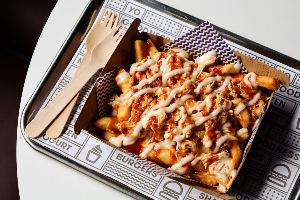 southern fried chicken, bacon, cheese sauce, YOMG house-made sloppy joe sauce, secret seasoned shoestring fries, southern mayo