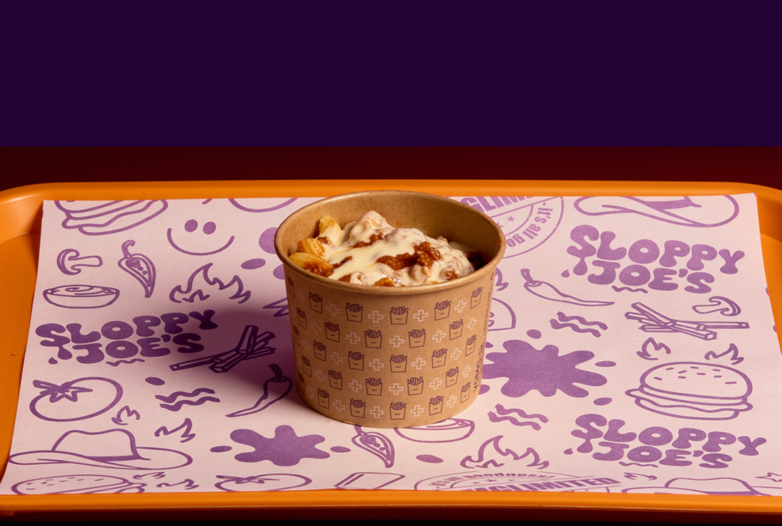 Parmesan-crumbed fried mozzarella stix (2 pce), crunchy fried chick’n strips (3 pce), joe’s macaroni and cheese, secret seasoned shoestring fries, with a side of bechamel sauce, YOMG house-made sloppy joe sauce and chipotle mayo