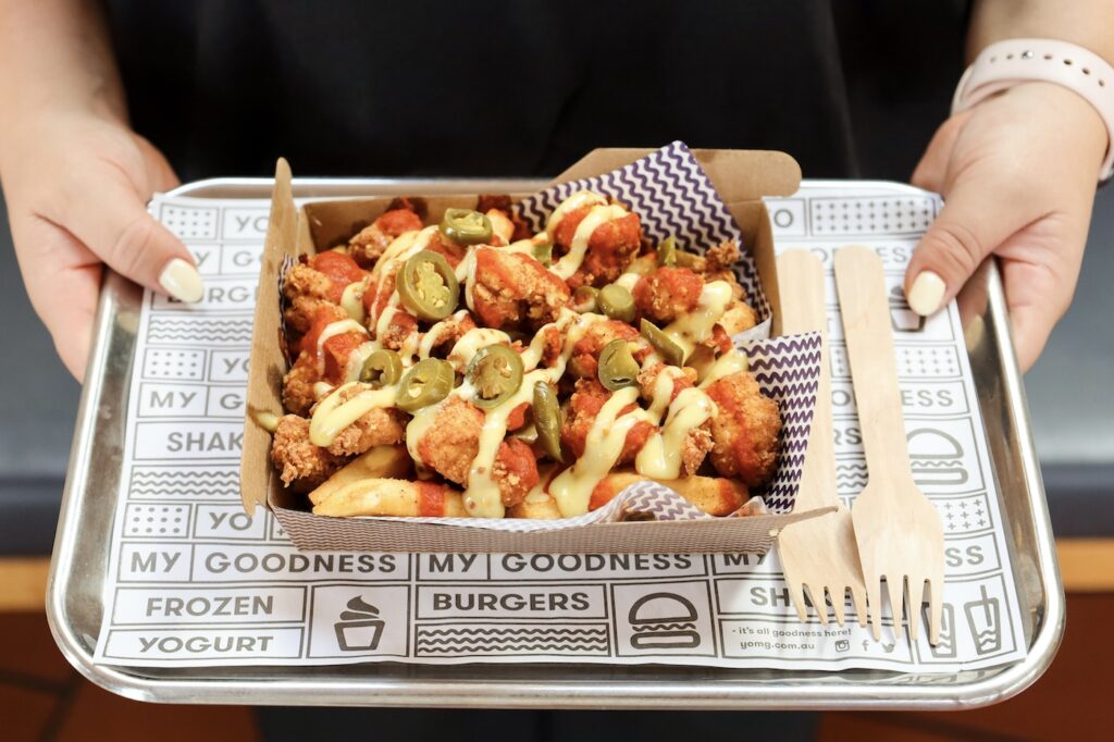 southern fried chicken, bacon, cheese sauce, YOMG house-made sloppy joe sauce, secret seasoned shoestring fries, southern mayo